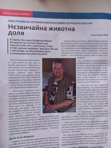 30. септембар 2024.Наша корисница из објекта у Руском Крстуру, Стефанија Бесермињи, је својом „необичном“ животном причом заинтригирала, осим нас, и ширу популацију путем интервјуа који је дала за часопис на русинском језику „Руске слово“ новинарки Марији Афич.